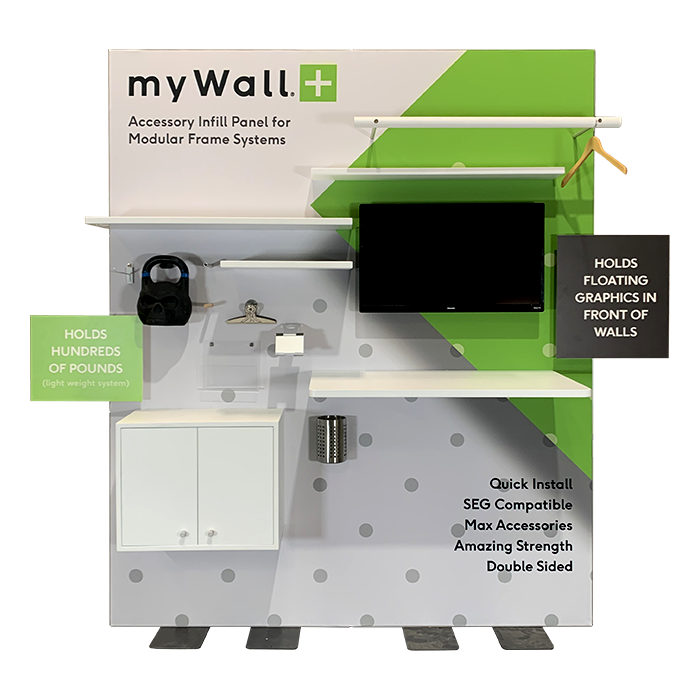 myWall+, the innovative pegwall panel that is seamlessly compatible and purpose-built to transform the trade show industry. This groundbreaking system of interlocking infill panels offers unparalleled flexibility, durability, and strength, making it the ultimate solution for mounting shelves, monitors, or anything that needs to go up on a wall.