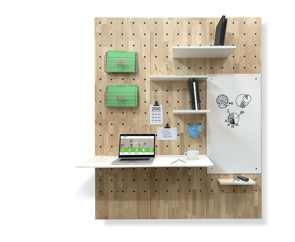 Whether your pegboard system is freestanding or installed on the wall, it can easily be customized in a matter of minutes with an endless variety of accessories. Your myWall® can be updated with shelving, whiteboards, desks, pendant lights, hidden power cord storage, and anything else you need to focus on your work at hand.