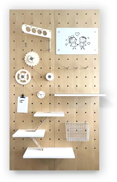 The potential ways to use a myWall® premium pegboard system in a child’s playroom are unlimited. With over 50+ add-on accessories available, our pegboard wall system can be customized to maximize both space and creativity. From adding basketball hoops, to Lego tables, doll house shelves, and rock climbing holds; myWall encourages years of safe, creative fun and development.