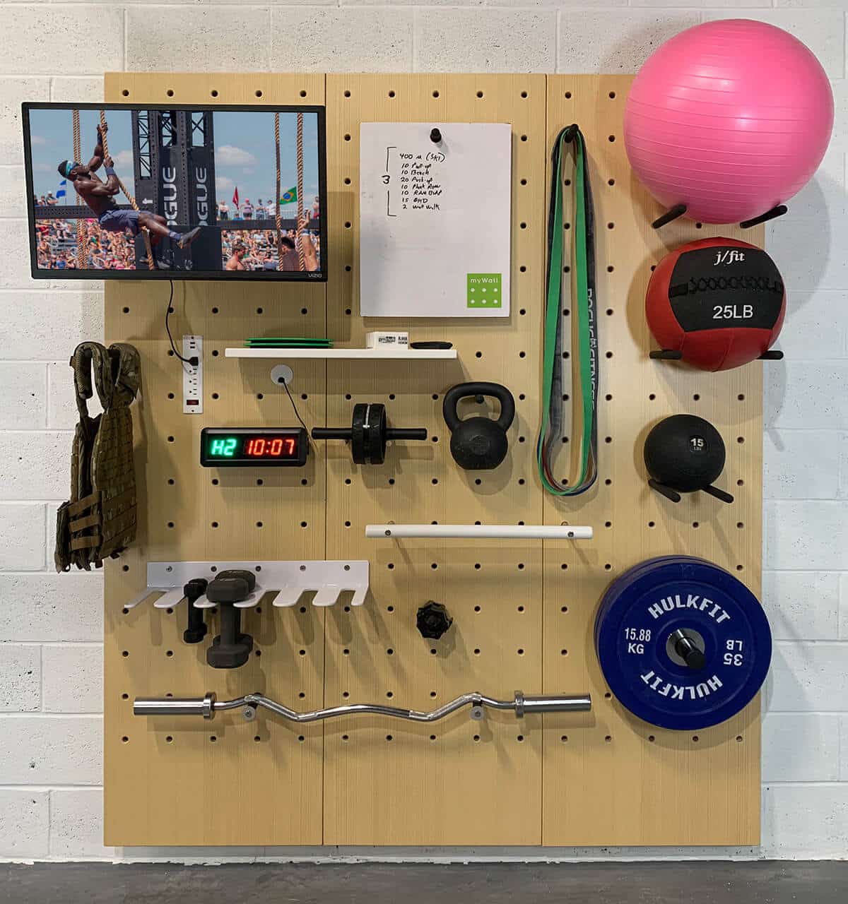 Having a proper home gym storage space to get your heart pumping is easy with myWall®. Our premium pegboard panels are simple to install, are sturdy enough to hold workout equipment, and can be styled to fit anyone’s needs. Each panel can support up to 4,000 pounds—which means myWall® can easily store and display dumbbells, jump ropes, yoga blocks, and workout mats.