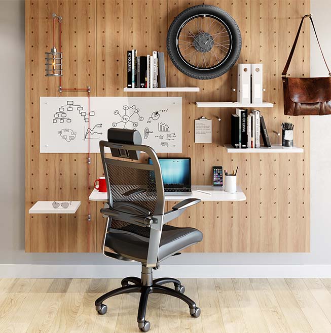 Adding a myWall® pegboard system to your home office elevates the appearance of any work environment while doing double duty as a practical storage and organizing solution. We offer several curated, ready-to-buy work bundles that include shelves, magnetic white boards, folder files, display clips, and even desks. Plus there are over 50+ add-on accessories to suit your needs.