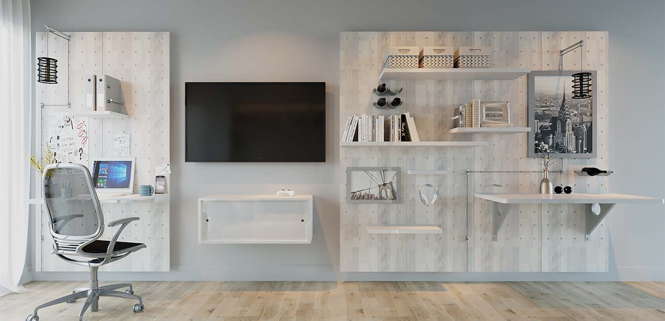 myWall offers a functional, modern, and versatile solution for a busy home life without sacrificing aesthetics. The system is engineered to safely and efficiently adapt to changing requirements in any area of the home, from displaying personal items in a bedroom to organizing a home office to outfitting a personal gym.